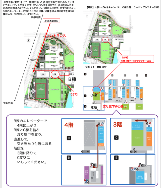 B棟(立命館いばらきフューチャープラザ)のエレベーターで4階に上がり,渡り廊下を渡り,階段を降りて会場(C373)にいらしてください。
